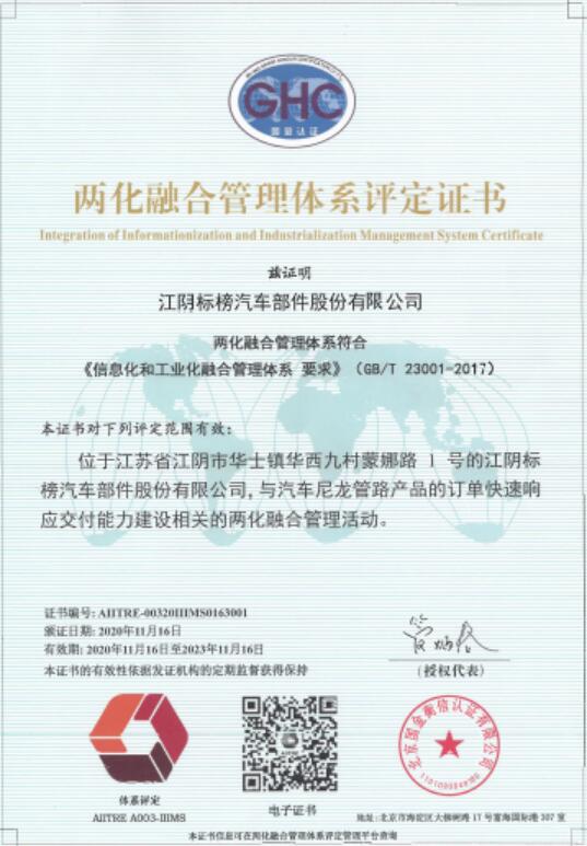 近日,公司顺利通过两化融合管理体系评定,并获得评定证书。